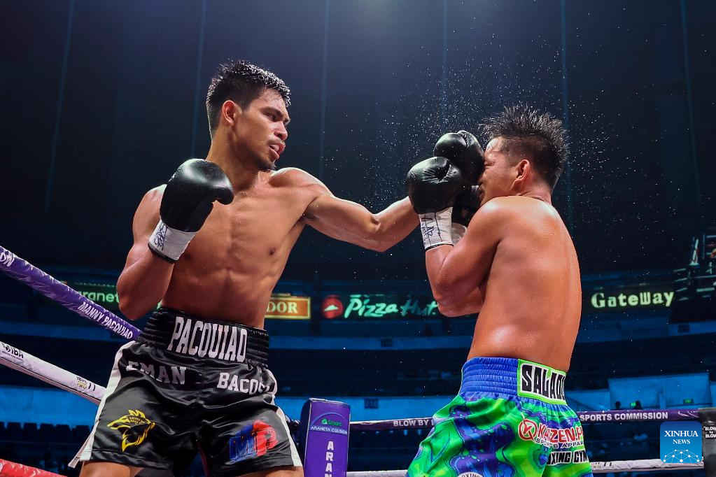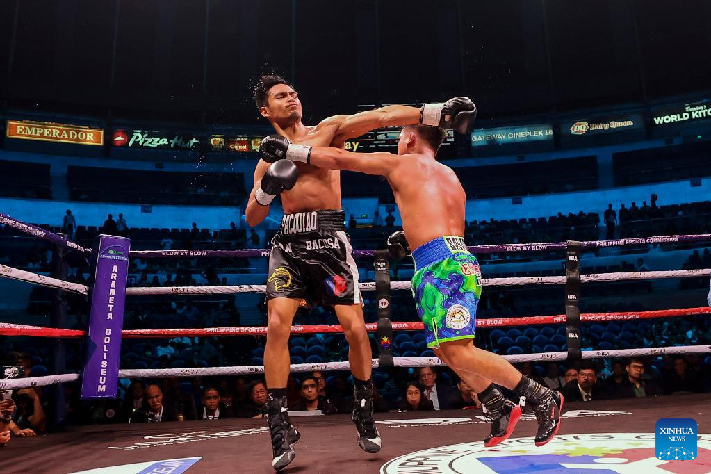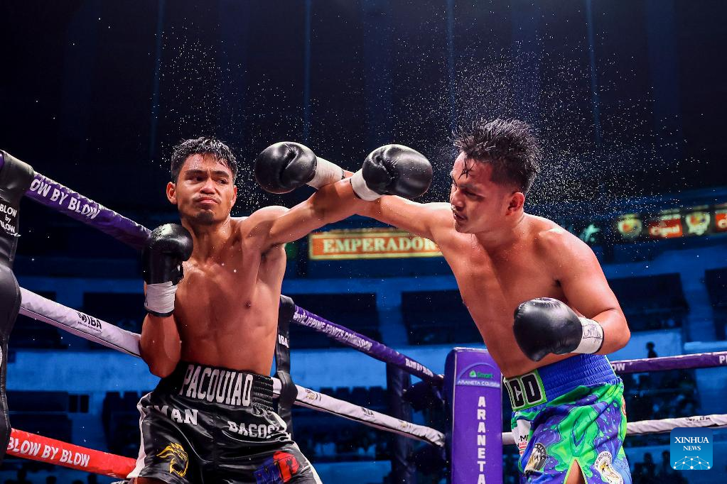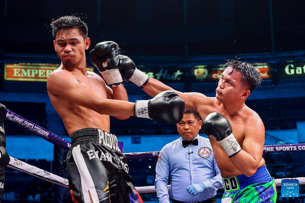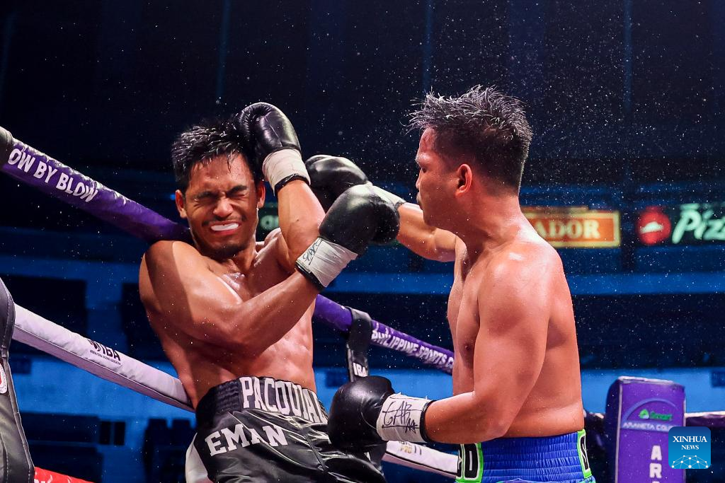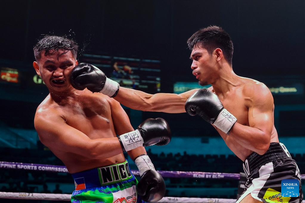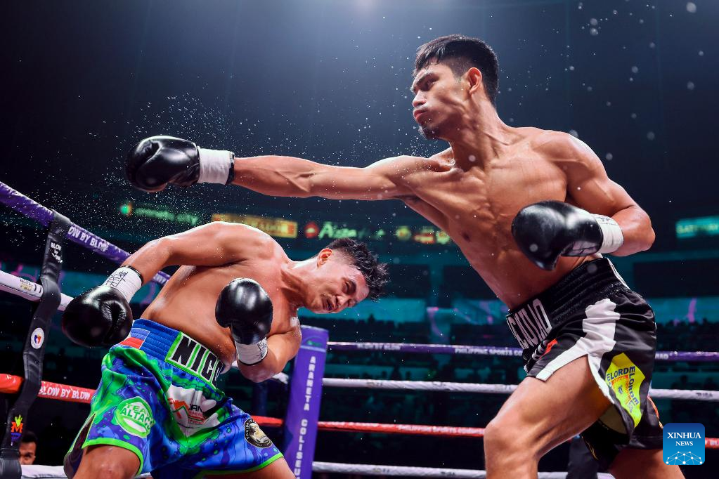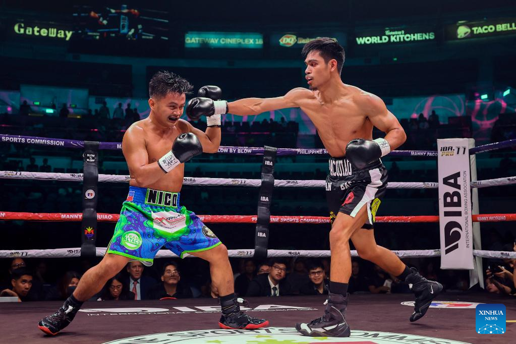 Eman Bacosa (R) of the Philippines competes against Nico Salado of the Philippines during the lightweight match at the Thrilla in Manila: 50th Anniversary in Quezon City, the Philippines on Oct. 29, 2025. (Xinhua/Rouelle Umali)