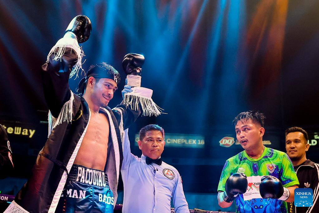 Eman Bacosa (1st L) of the Philippines celebrates after being declared the winner against Nico Salado (2nd R) of the Philippines after the lightweight match at the Thrilla in Manila: 50th Anniversary in Quezon City, the Philippines on Oct. 29, 2025. (Xinhua/Rouelle Umali)