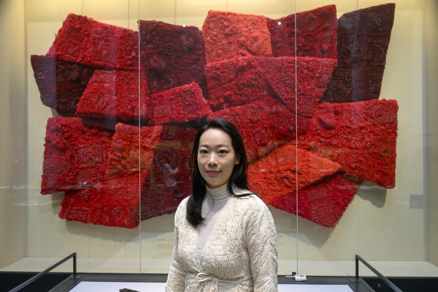 Among them is Lin Fanglu, whose fiber sculpture "She's Bestowed Love" rises like a crimson wave, commanding the China Gallery's space. The work employs the ancient Bai ethnic tie-dye technique, once used to decorate clothing. Lin first encountered the craft during her 2014 stay in Dali Bai Autonomous Prefecture, where she lived among local artisans.