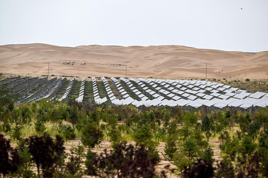 This photo taken on Sept. 10, 2025 shows the Dalad Banner photovoltaic base in the Kubuqi Desert, north China's Inner Mongolia Autonomous Region. In the Kubuqi Desert, rows of blue solar panels stretch across the sands, turning the desert into a sea of clean energy. In recent years, the area has adopted a "PV-based desert control" model, generating green electricity above while restoring the ecosystem below. This approach not only boosts new energy development but also helps combat desertification. (Xinhua/Li Zhipeng)