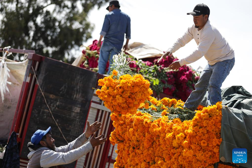 A vendor unloads marigold flowers, known as cempasuchil, used during Day of the Dead celebrations, at the central de Abasto market in Mexico City, Oct. 29, 2025. (Photo by Francisco Canedo/Xinhua)