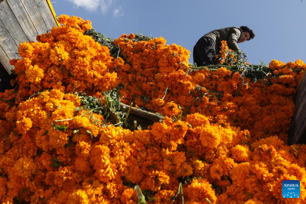 People buy marigold flowers, known as cempasuchil, used during Day of the Dead celebrations, at the central de Abasto market in Mexico City, Oct. 29, 2025. (Xinhua/Li Mengxin)