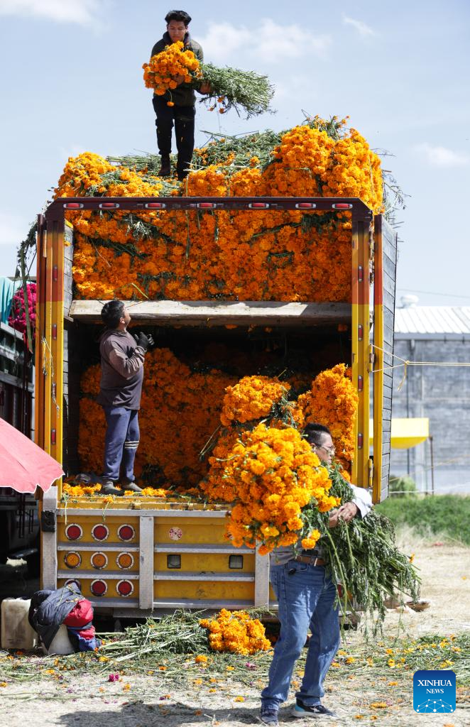 Vendors unload marigold flowers, known as cempasuchil, used during Day of the Dead celebrations, at the central de Abasto market in Mexico City, Oct. 29, 2025. (Photo by Francisco Canedo/Xinhua)