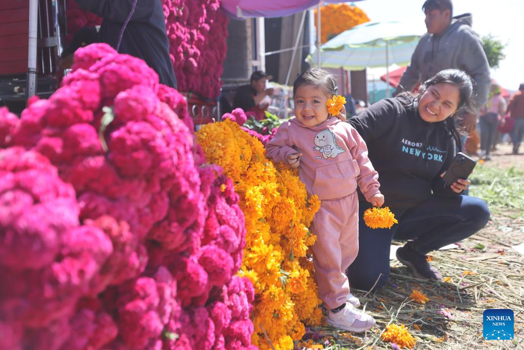 A girl plays with marigold flowers, known as cempasuchil, used during Day of the Dead celebrations, at the central de Abasto market in Mexico City, Oct. 29, 2025. (Xinhua/Li Mengxin)