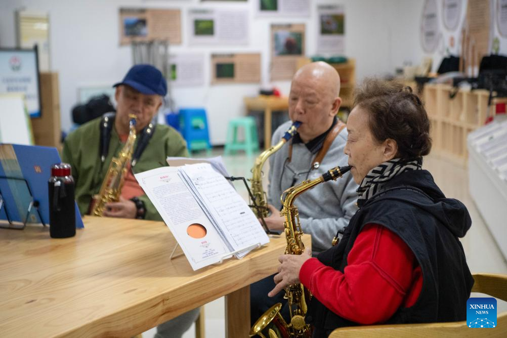 Senior residents practice musical instruments at a community-based activity center for elderly people in Jiangbei District, southwest China's Chongqing Municipality, Oct. 29, 2025. A series of celebration activities were held across the country to mark Chongyang Festival, which falls on Oct. 29 this year. Also known as China's Seniors' Day, it honors the country's traditional virtues of filial piety and family love. (Xinhua/Tang Yi)