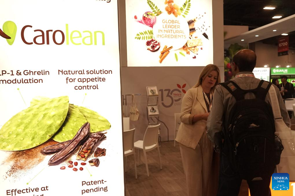People visit an exhibition booth at SupplySide Global, in Las Vegas, Nevada, the United States, on Oct. 29, 2025. The SupplySide Global, North America's leading dietary supplement event, opened its expo hall on Wednesday in Las Vegas, U.S. state of Nevada.