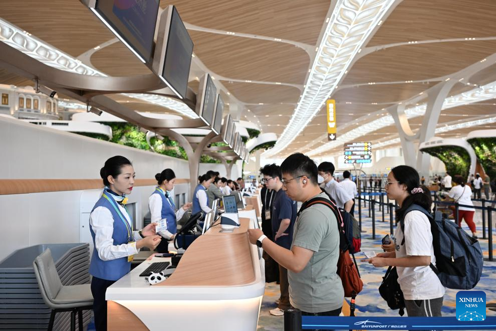 Passengers check in to take China Eastern Airlines MU6308, the first flight to depart Guangzhou Baiyun International Airport Terminal 3 in Guangzhou, south China's Guangdong Province, Oct. 30, 2025. The Baiyun airport in Guangzhou, capital of south China's Guangdong Province, on Thursday officially put into operation its Terminal 3 and fifth runway, making it China's first civil airport to operate five commercial runways.