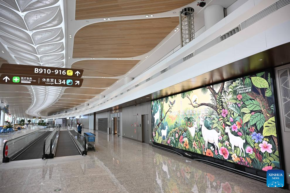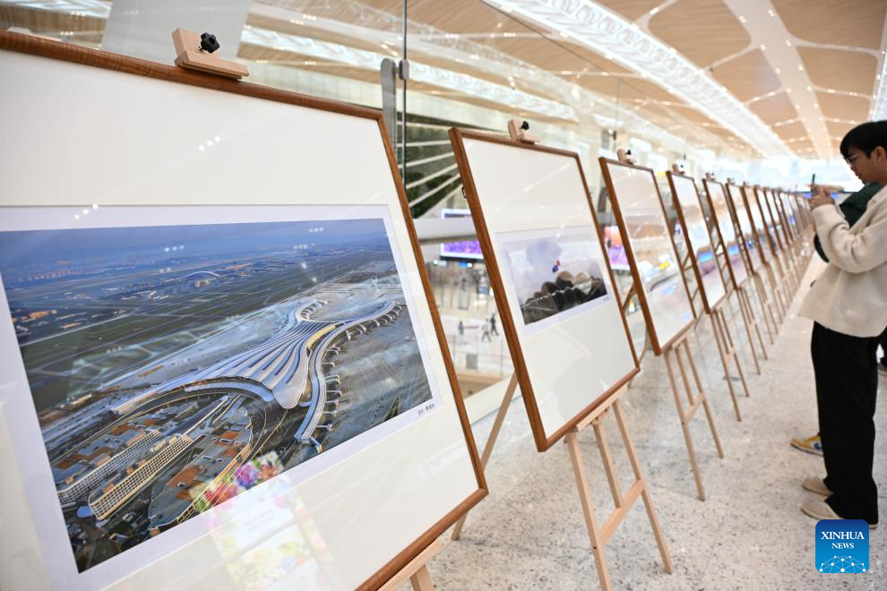 People visit a photo exhibition at Guangzhou Baiyun International Airport Terminal 3 in Guangzhou, south China's Guangdong Province, Oct. 30, 2025. The Baiyun airport in Guangzhou, capital of south China's Guangdong Province, on Thursday officially put into operation its Terminal 3 and fifth runway, making it China's first civil airport to operate five commercial runways.