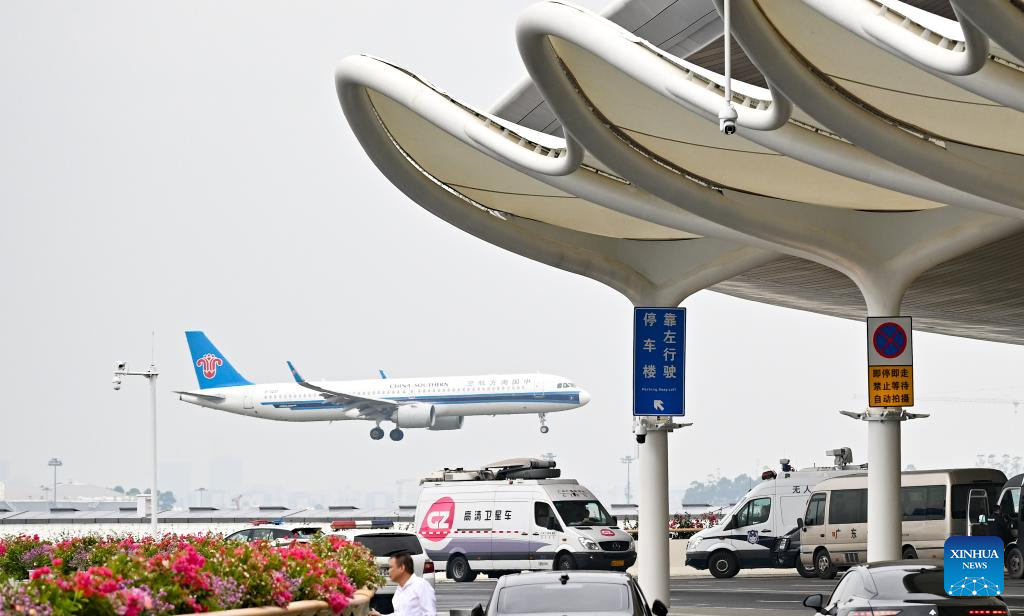 This photo taken outside Guangzhou Baiyun International Airport Terminal 3 shows an airliner landing in Guangzhou, south China's Guangdong Province, Oct. 30, 2025. The Baiyun airport in Guangzhou, capital of south China's Guangdong Province, on Thursday officially put into operation its Terminal 3 and fifth runway, making it China's first civil airport to operate five commercial runways.