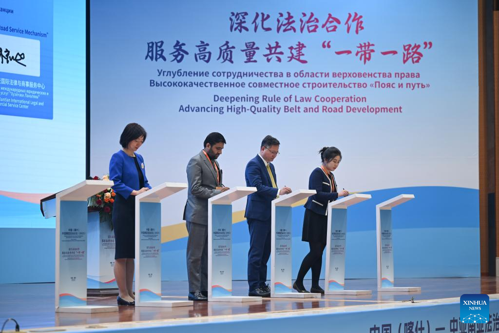 Guests attend a signing ceremony during the China (Kashgar) - Central and South Asia Forum on the Rule of Law (2025) in Kashgar, northwest China's Xinjiang Uygur Autonomous Region, Oct. 30, 2025. The forum kicked off here on Thursday. (Xinhua/Ding Lei)