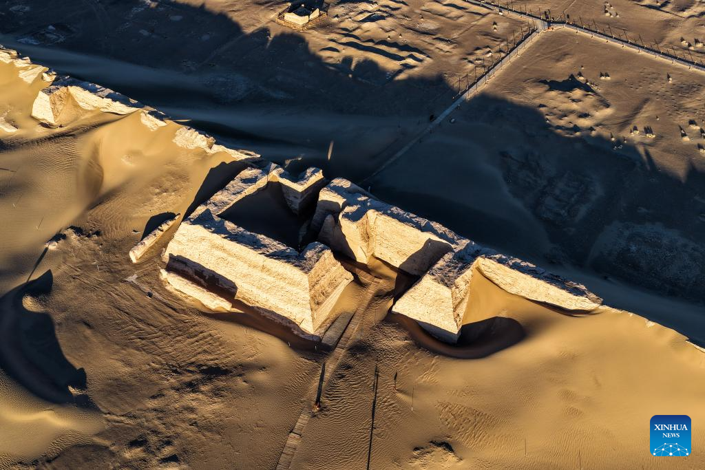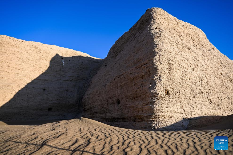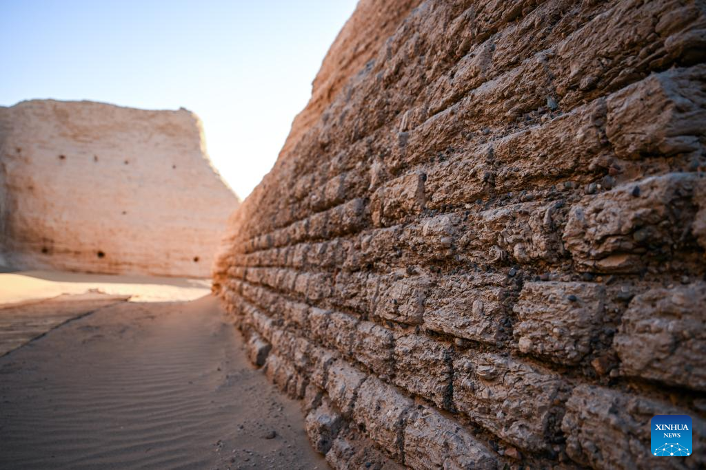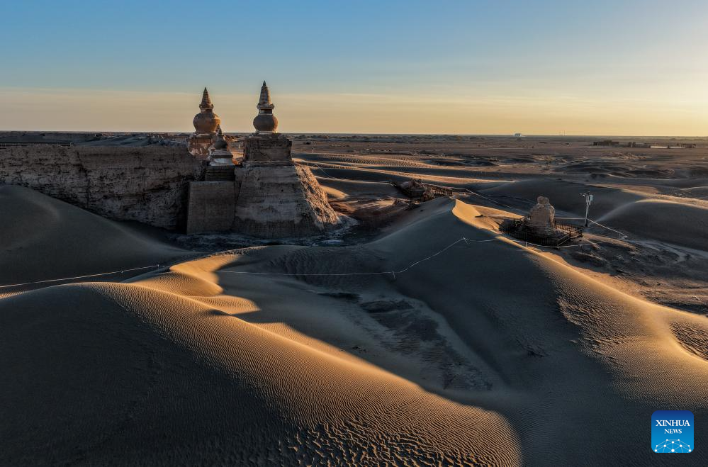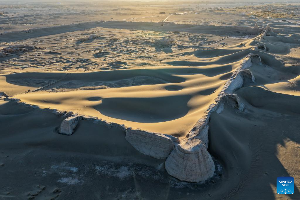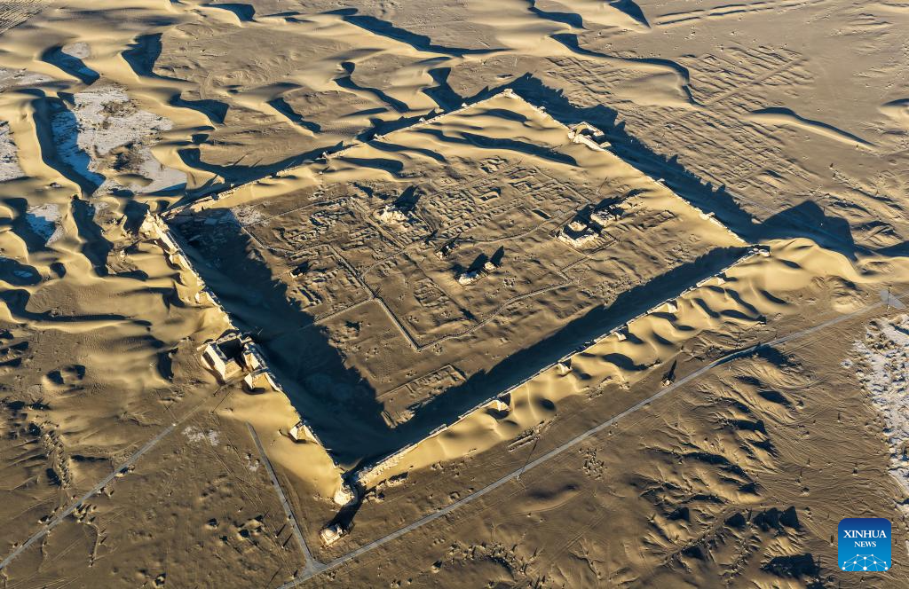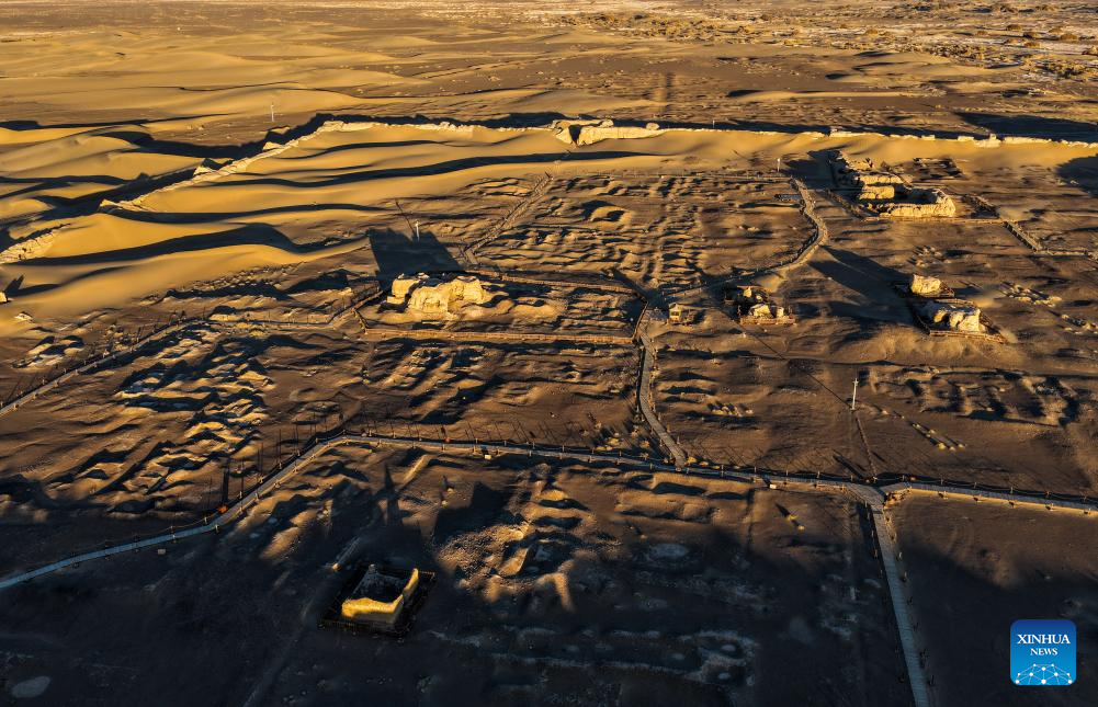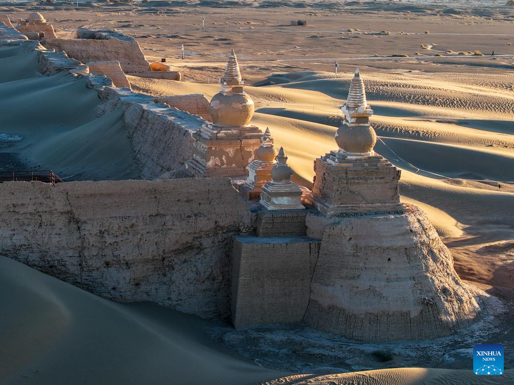 An aerial drone photo taken on Oct. 29, 2025 shows a view of the Heicheng ruins in Ejina Banner of Alxa League, north China's Inner Mongolia Autonomous Region. The Heicheng ruins, built in the ninth century, was the largest and best preserved ancient city on the Silk Road. (Xinhua/Lian Zhen)