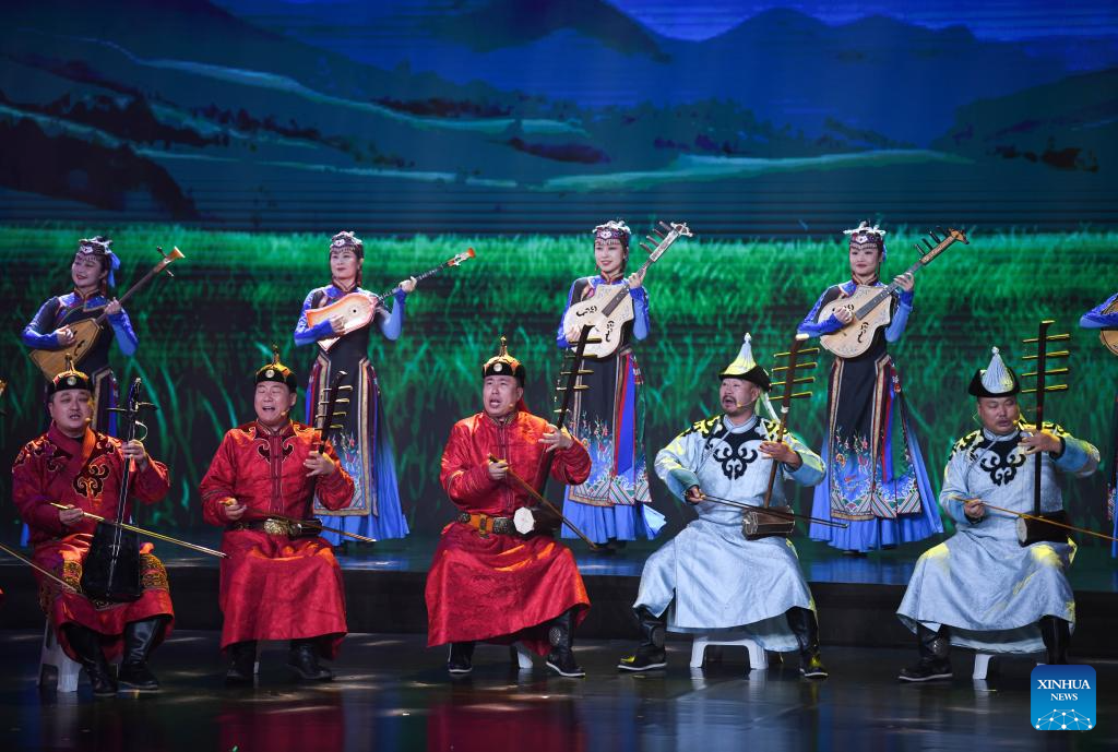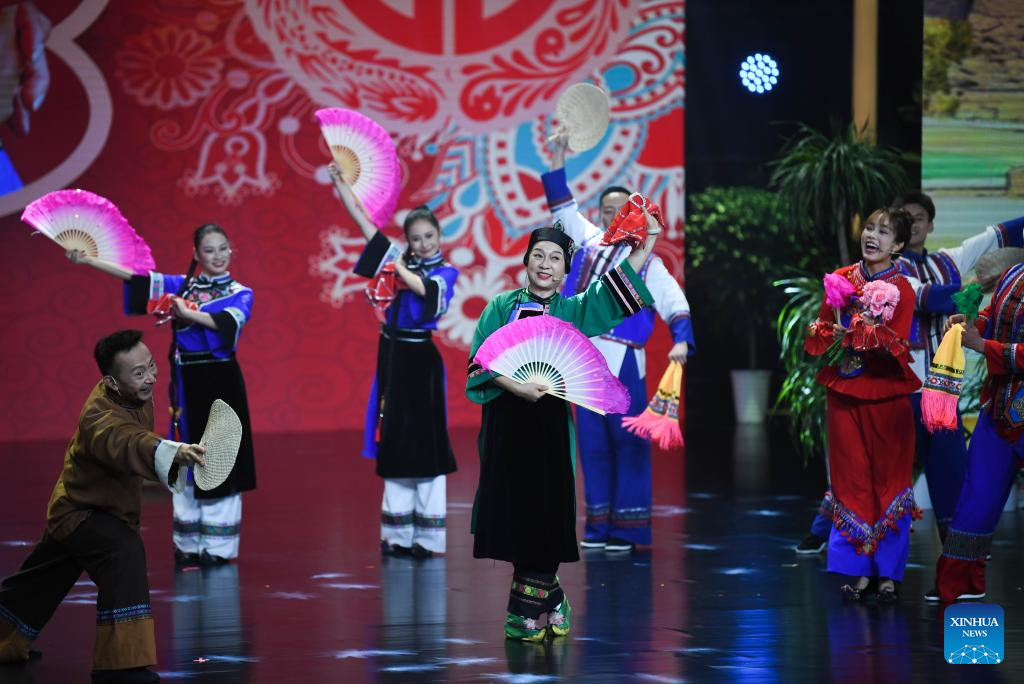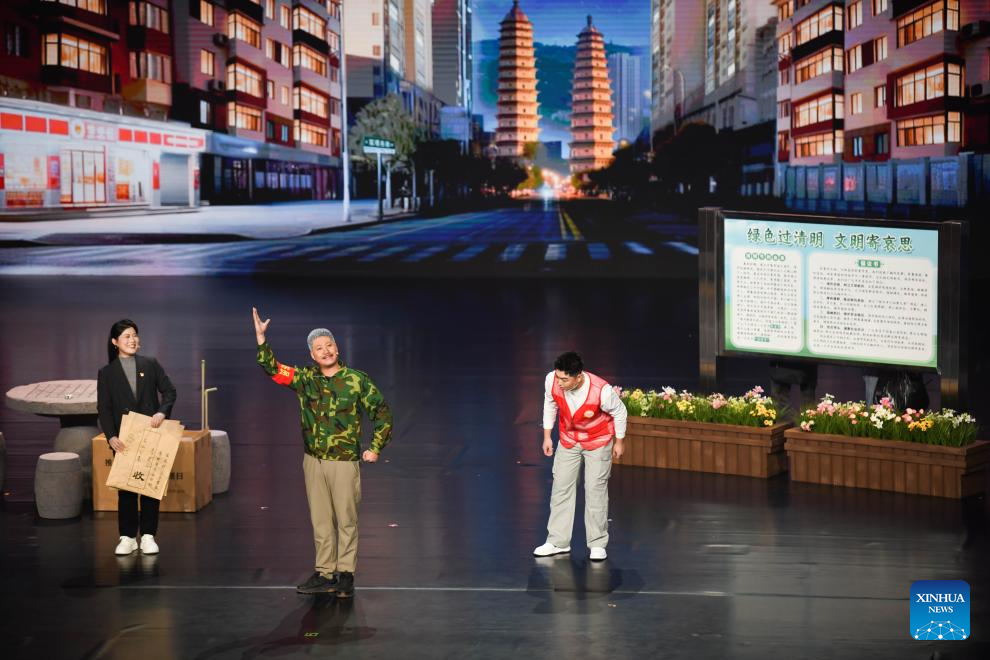 Artists perform during a performance on social etiquette and civility in rural areas in Yan'an, northwest China's Shaanxi Province, Oct. 29, 2025. The event held in Yan'an staged cultural and artistic performances selected from across the country, showcasing new trends in social etiquette and civility in rural areas. (Xinhua/Zhang Bowen)