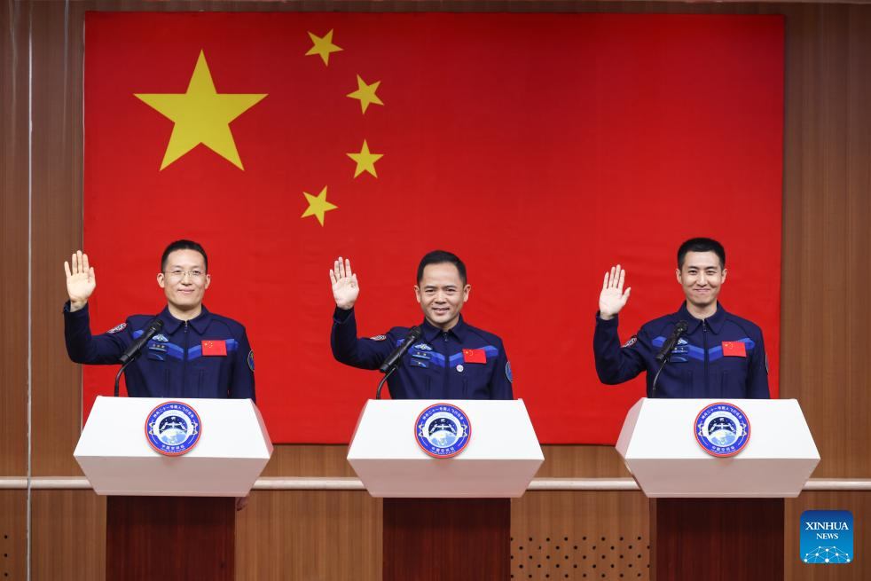Chinese astronauts Zhang Lu (C), Wu Fei (R) and Zhang Hongzhang for the upcoming Shenzhou-21 spaceflight mission, meet the press in Jiuquan Satellite Launch Center in northwest China on Oct. 30, 2025. (Xinhua/Li Minggang)