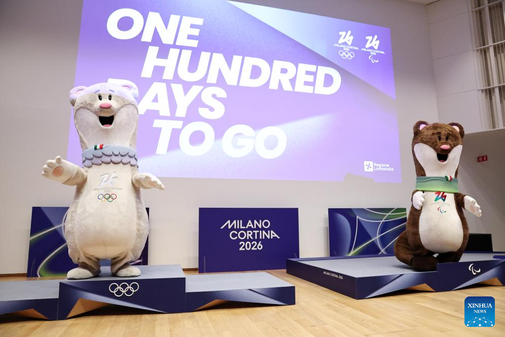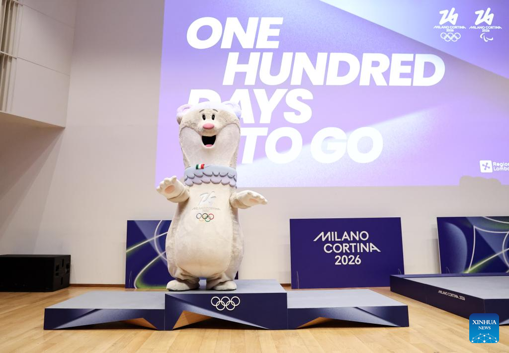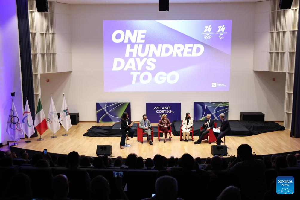 A ceremony marking 100 days to the opening of the Milano-Cortina 2026 Olympic Winter Games was held at Palazzo Lombardia in Milan, where organizers unveiled the official podiums for the Olympic and Paralympic Games and introduced 12 "digital torchbearers", symbolizing the start of the final stage of preparations for the event. (Xinhua/Li Jing)