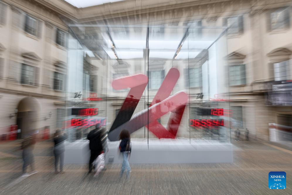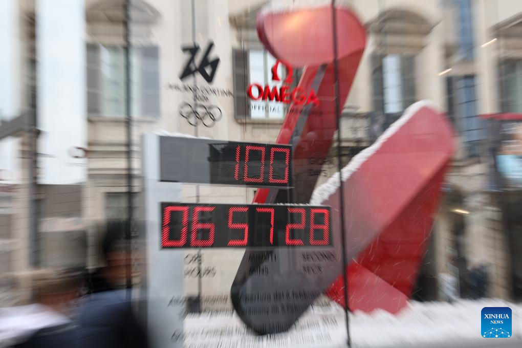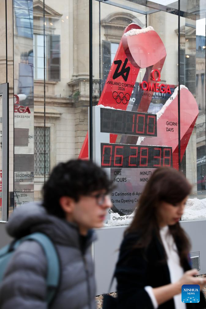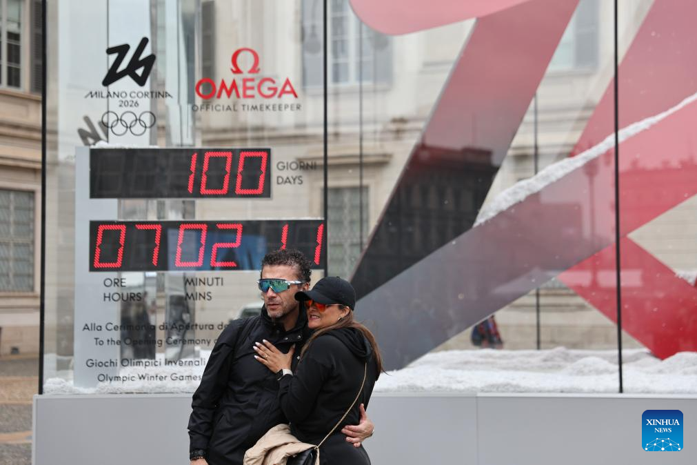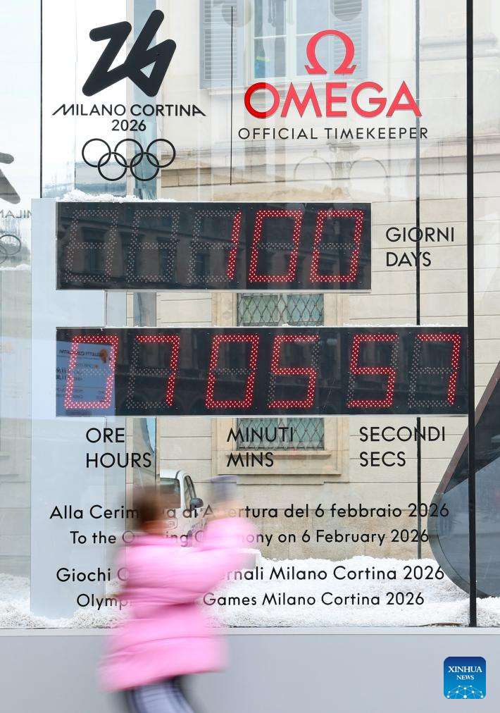 People walk past the digital countdown timer of Milano-Cortina 2026 Olympic Games in Milan, Italy, Oct. 29, 2025. A ceremony marking 100 days to the opening of the Milano-Cortina 2026 Olympic Winter Games was held at Palazzo Lombardia in Milan, where organizers unveiled the official podiums for the Olympic and Paralympic Games and introduced 12 "digital torchbearers", symbolizing the start of the final stage of preparations for the event. (Xinhua/Li Jing)