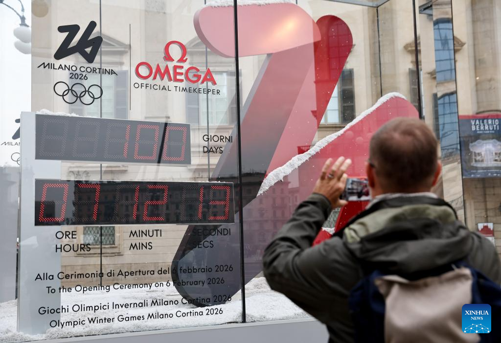 A man takes a photo of the digital countdown timer of Milano-Cortina 2026 Olympic Games in Milan, Italy, Oct. 29, 2025. A ceremony marking 100 days to the opening of the Milano-Cortina 2026 Olympic Winter Games was held at Palazzo Lombardia in Milan, where organizers unveiled the official podiums for the Olympic and Paralympic Games and introduced 12 "digital torchbearers", symbolizing the start of the final stage of preparations for the event. (Xinhua/Li Jing)