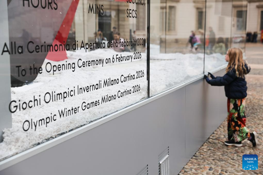 A girl takes a photo of the digital countdown timer of Milano-Cortina 2026 Olympic Games in Milan, Italy, Oct. 29, 2025. A ceremony marking 100 days to the opening of the Milano-Cortina 2026 Olympic Winter Games was held at Palazzo Lombardia in Milan, where organizers unveiled the official podiums for the Olympic and Paralympic Games and introduced 12 "digital torchbearers", symbolizing the start of the final stage of preparations for the event. (Xinhua/Li Jing)
