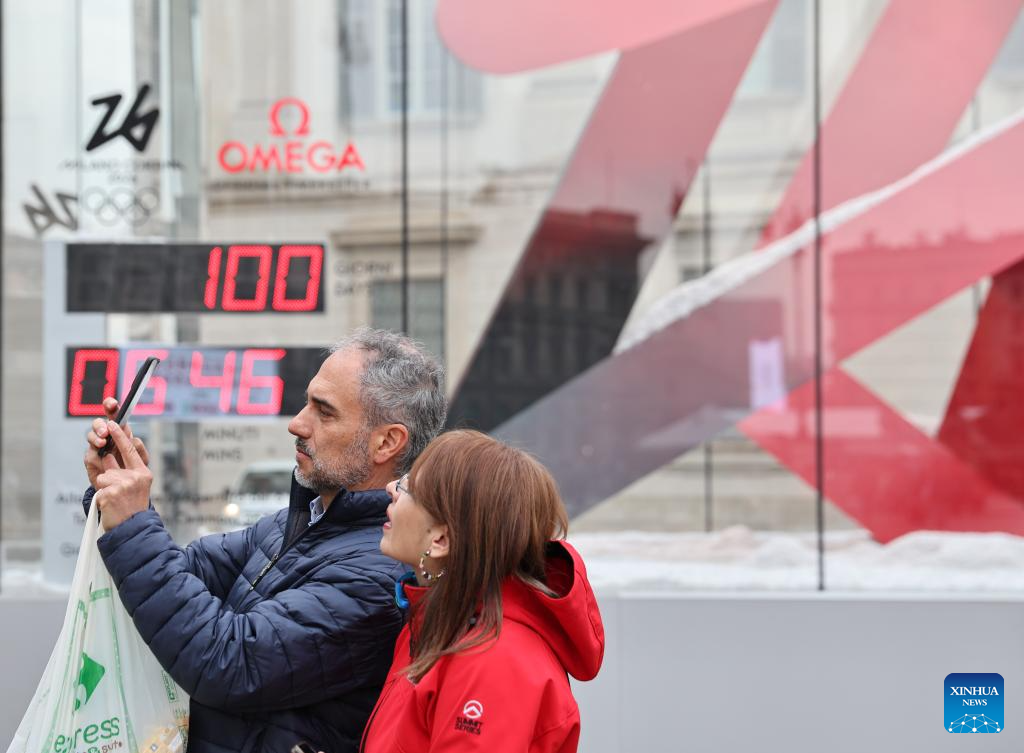 People take a photo with the digital countdown timer of Milano-Cortina 2026 Olympic Games in Milan, Italy, Oct. 29, 2025. A ceremony marking 100 days to the opening of the Milano-Cortina 2026 Olympic Winter Games was held at Palazzo Lombardia in Milan, where organizers unveiled the official podiums for the Olympic and Paralympic Games and introduced 12 "digital torchbearers", symbolizing the start of the final stage of preparations for the event. (Xinhua/Li Jing)