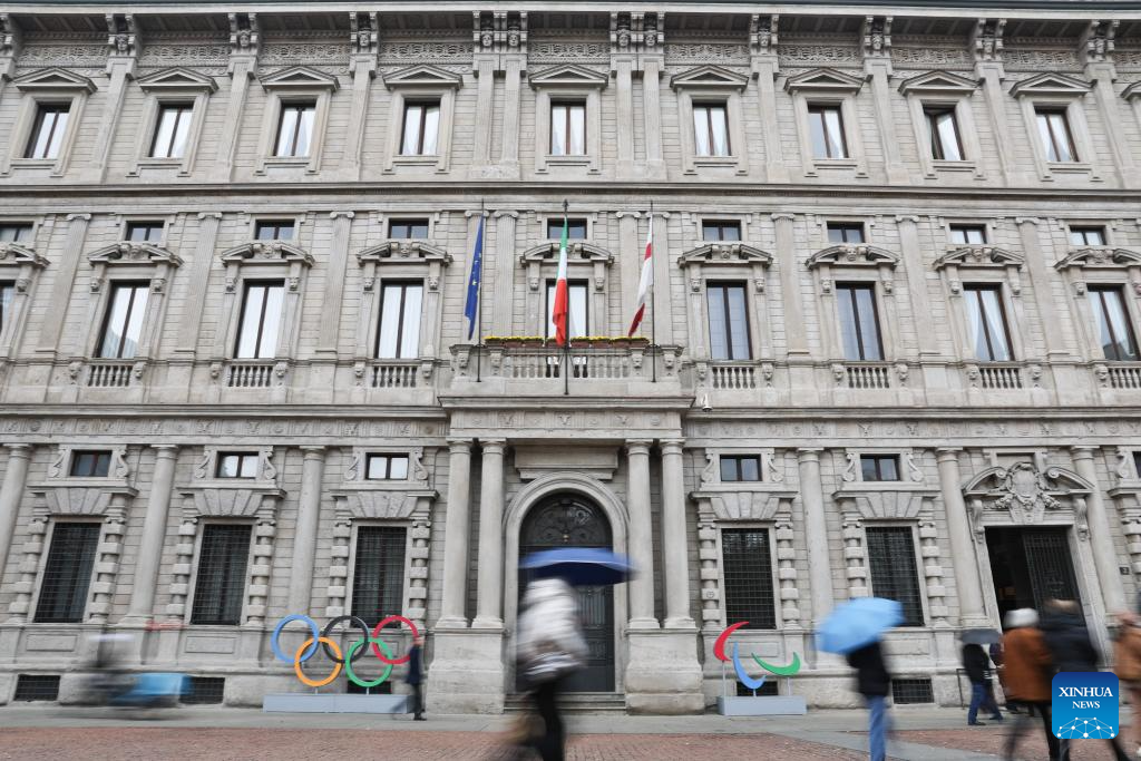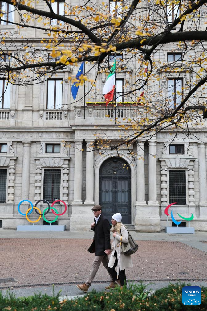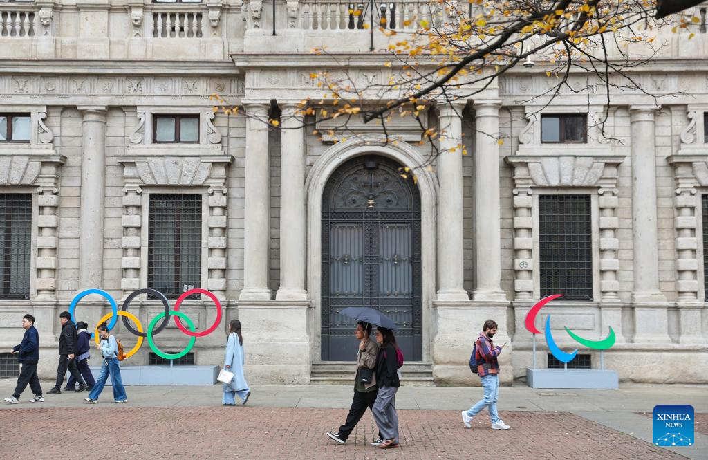 People walk past the emblems of Olympic and Paralympic Games in front of the City Hall of Milan in Milan, Italy, Oct. 29, 2025. A ceremony marking 100 days to the opening of the Milano-Cortina 2026 Olympic Winter Games was held at Palazzo Lombardia in Milan, where organizers unveiled the official podiums for the Olympic and Paralympic Games and introduced 12 "digital torchbearers", symbolizing the start of the final stage of preparations for the event. (Xinhua/Li Jing)