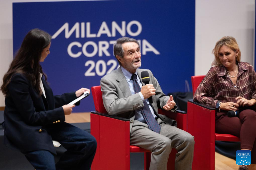 Attilio Fontana (C), President of the Lombardy Region, speaks during a ceremony marking 100 days to the opening of the Milano-Cortina 2026 Olympic Winter Games at Palazzo Lombardia in Milan, Italy, Oct. 29, 2025.
