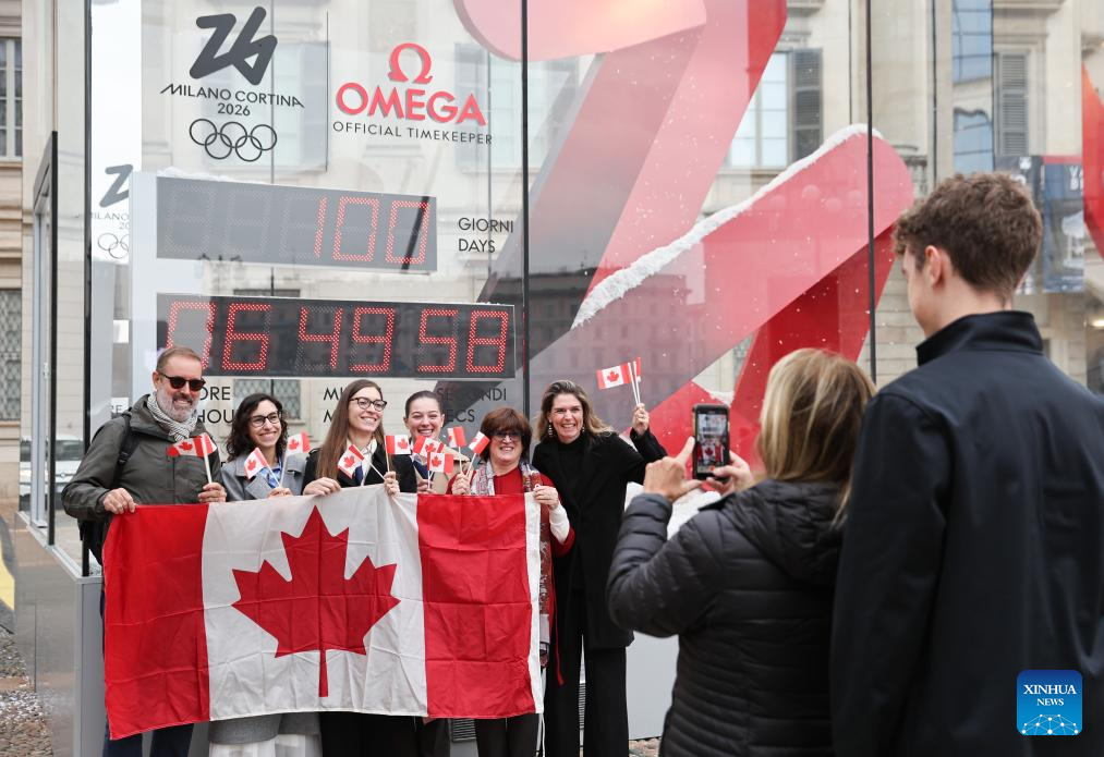 Staff of Canadian embassy to Italy take a photo with the digital countdown timer of Milano-Cortina 2026 Olympic Games in Milan, Italy, Oct. 29, 2025. A ceremony marking 100 days to the opening of the Milano-Cortina 2026 Olympic Winter Games was held at Palazzo Lombardia in Milan, where organizers unveiled the official podiums for the Olympic and Paralympic Games and introduced 12 "digital torchbearers", symbolizing the start of the final stage of preparations for the event. (Xinhua/Li Jing)