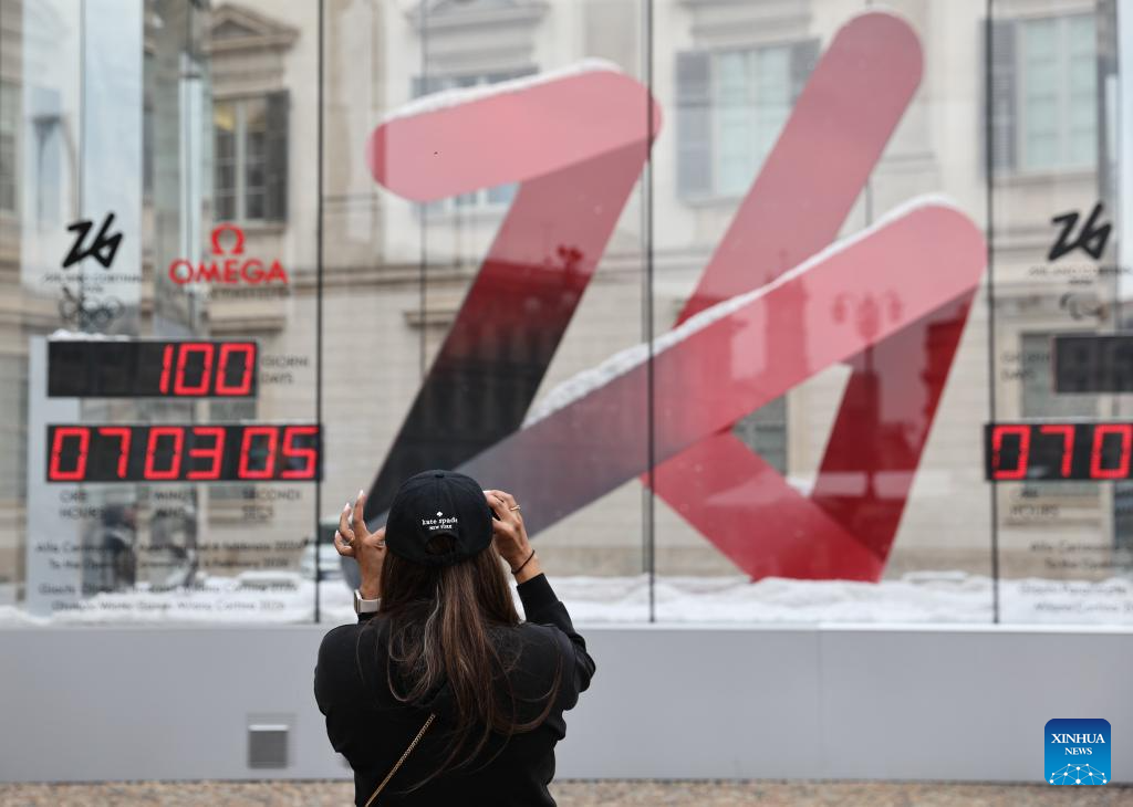 A woman takes a photo of the digital countdown timer of Milano-Cortina 2026 Olympic Games in Milan, Italy, Oct. 29, 2025. A ceremony marking 100 days to the opening of the Milano-Cortina 2026 Olympic Winter Games was held at Palazzo Lombardia in Milan, where organizers unveiled the official podiums for the Olympic and Paralympic Games and introduced 12 "digital torchbearers", symbolizing the start of the final stage of preparations for the event. (Xinhua/Li Jing)