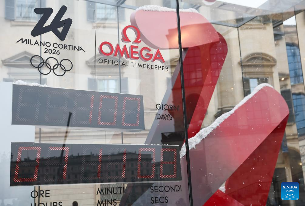 This photo taken on Oct. 29, 2025 shows the digital countdown timer of Milano-Cortina 2026 Olympic Games. A ceremony marking 100 days to the opening of the Milano-Cortina 2026 Olympic Winter Games was held at Palazzo Lombardia in Milan, where organizers unveiled the official podiums for the Olympic and Paralympic Games and introduced 12 "digital torchbearers", symbolizing the start of the final stage of preparations for the event. (Xinhua/Li Jing)