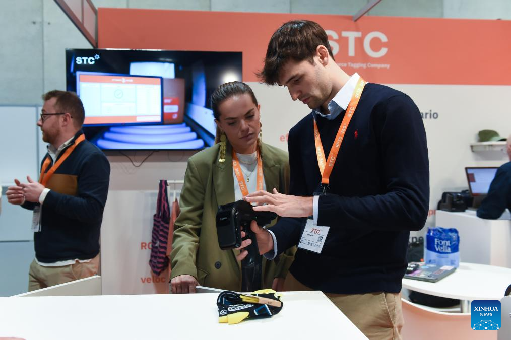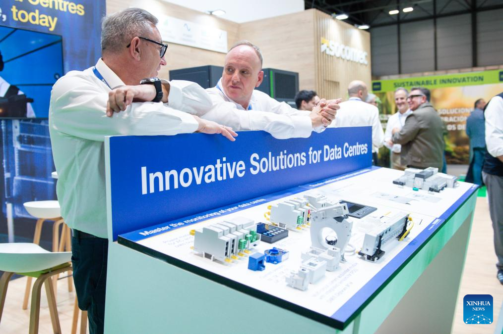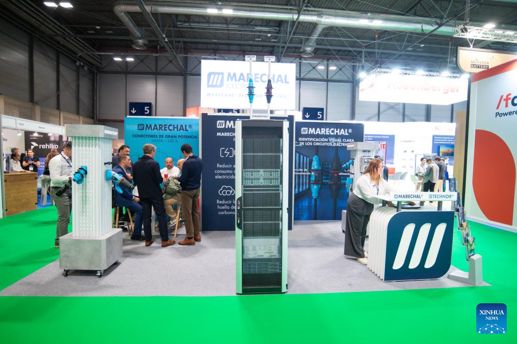 This photo taken on Oct. 29, 2025 shows a booth at the Tech Show Madrid 2025 in Madrid, Spain. The two-day exhibition opened here on Wednesday, attracting over 400 exhibitors to attend. (Photo by Gustavo Valiente/Xinhua)