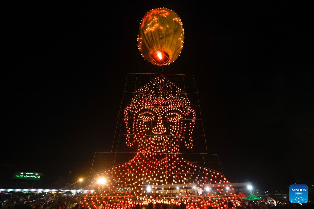 A hot-air balloon carrying small lanterns is pictured during the Taunggyi Hot-Air Balloon Festival in Taunggyi, Shan state, Myanmar, Oct. 30, 2025. (Xinhua/Myo Kyaw Soe)