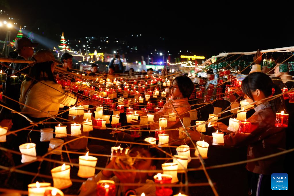 People attach small lanterns to a hot-air balloon during the Taunggyi Hot-Air Balloon Festival in Taunggyi, Shan state, Myanmar, Oct. 31, 2025. (Xinhua/Myo Kyaw Soe)