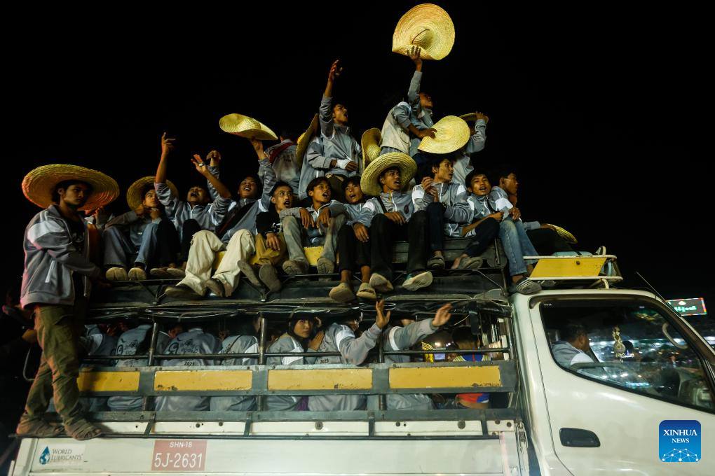 People celebrate after releasing a hot-air balloon during the Taunggyi Hot-Air Balloon Festival in Taunggyi, Shan state, Myanmar, Oct. 30, 2025. (Xinhua/Myo Kyaw Soe)