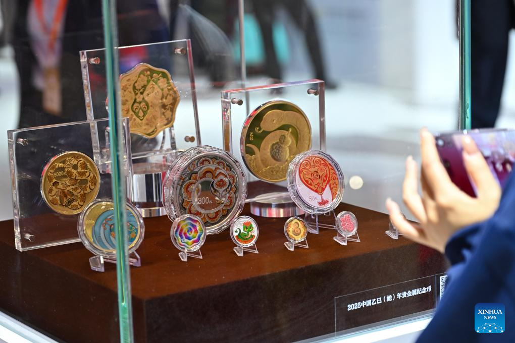 A visitor takes photos of commemorative coins issued for the Year of the Snake during the Beijing International Coin Exposition 2025 at the China National Convention Center in Beijing, capital of China, Oct. 31, 2025. The three-day exposition kicked off here on Friday, attracting 323 exhibitors from 21 countries and regions. (Xinhua/Li Xin)