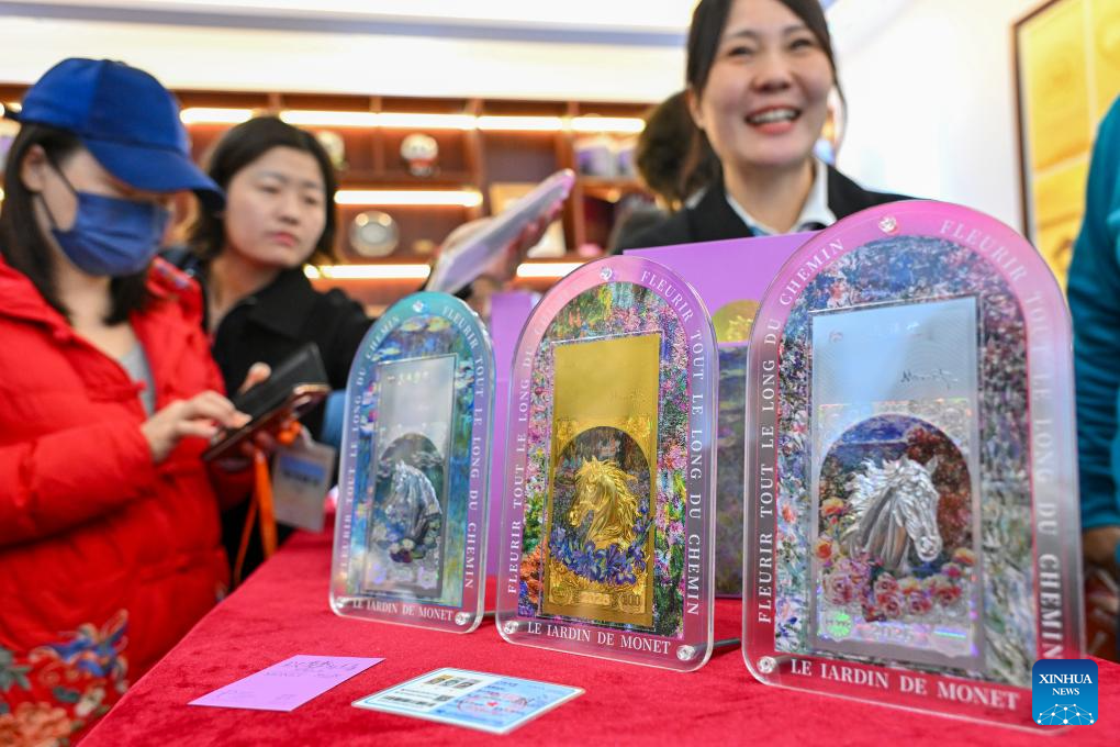 People view creative cultural products made of scraps of banknotes during the Beijing International Coin Exposition 2025 at the China National Convention Center in Beijing, capital of China, Oct. 31, 2025. The three-day exposition kicked off here on Friday, attracting 323 exhibitors from 21 countries and regions. (Xinhua/Li Xin)