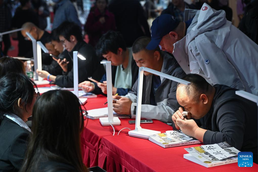 People learn about items during an auction preview of the Beijing International Coin Exposition 2025 at the China National Convention Center in Beijing, capital of China, Oct. 31, 2025. The three-day exposition kicked off here on Friday, attracting 323 exhibitors from 21 countries and regions. (Xinhua/Li Xin)
