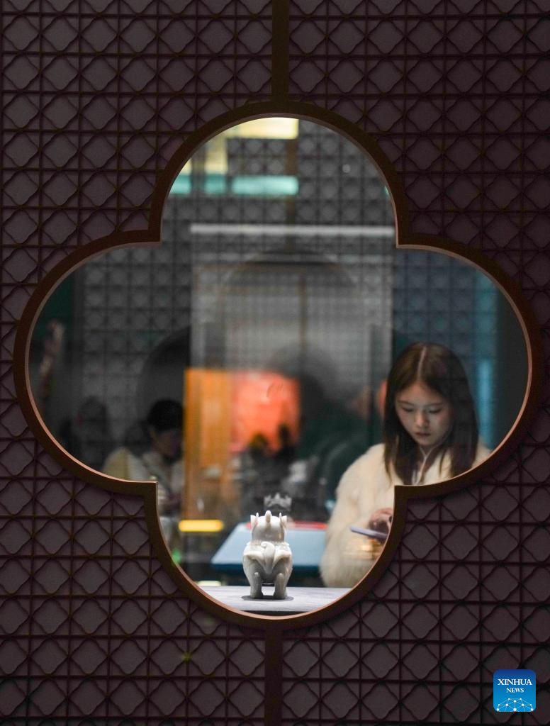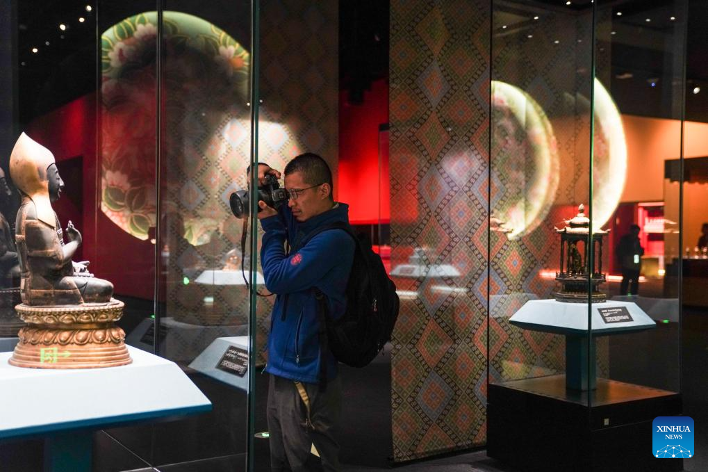 A tourist visits an exhibition at Xizang Museum in Lhasa, southwest China's Xizang Autonomous Region, Oct. 30, 2025. To celebrate the autonomous region's 60th founding anniversary, a joint exhibition showcasing cultural relics from the Palace Museum, the Xizang Museum, the Potala Palace and the Norbulingka is held in Lhasa. The exhibition will last till Dec. 1. (Xinhua/Zhou Jiayi)