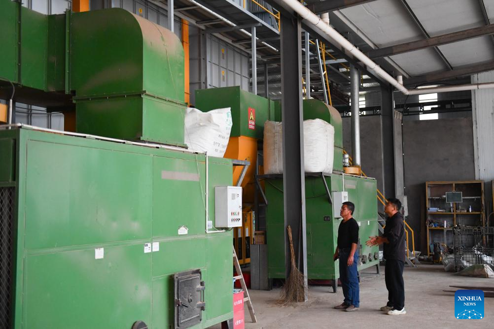 Qiu Bin (R) and his father Qiu Guoqing check the operation of the drying machine in Wangjiahu Village in Datonghu District of Yiyang City, central China's Hunan Province, Oct. 29, 2025.