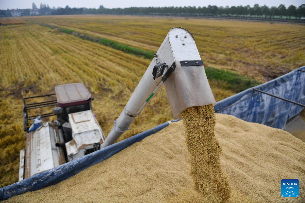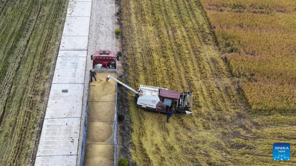 This photo shows harvested rice being loaded onto a truck in the fields in Wangjiahu Village, Datonghu District of Yiyang City, central China's Hunan Province, Oct. 29, 2025.