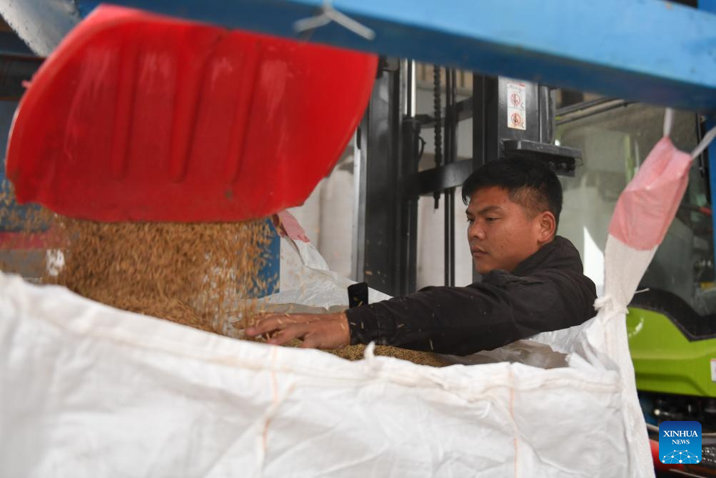 Qiu Bin packs dried rice in Wangjiahu Village in Datonghu District of Yiyang City, central China's Hunan Province, Oct. 30, 2025.