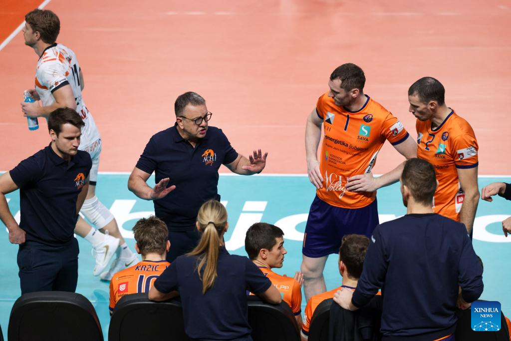 Igor Kolakovic (3rd L), coach of ACH Ljubljana, instructs players during the quarter-final second leg match between ACH Ljubljana and Orion Stars at the 2025/2026 CEV Champions League Men qualification round in Ljubljana, Slovenia, on Oct. 30, 2025. (Photo by Zeljko Stevanic/Xinhua)