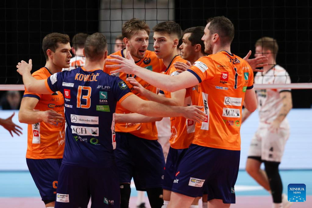 Players of ACH Ljubljana celebrate after scoring during the quarter-final second leg match between ACH Ljubljana and Orion Stars at the 2025/2026 CEV Champions League Men qualification round in Ljubljana, Slovenia, on Oct. 30, 2025. (Photo by Zeljko Stevanic/Xinhua)