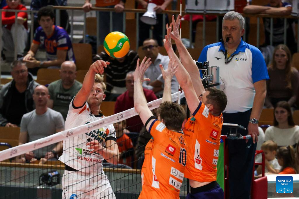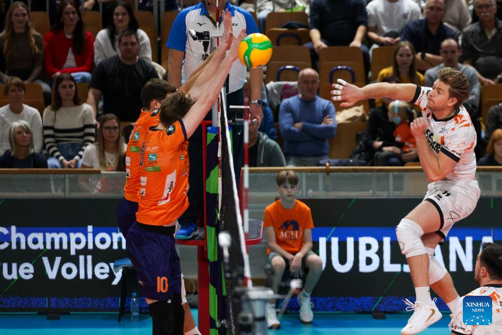 Alen Pajenk (4th R) of ACH Ljubljana spikes the ball during the quarter-final second leg match between ACH Ljubljana and Orion Stars at the 2025/2026 CEV Champions League Men qualification round in Ljubljana, Slovenia, on Oct. 30, 2025. (Photo by Zeljko Stevanic/Xinhua)