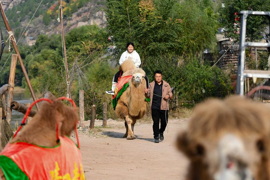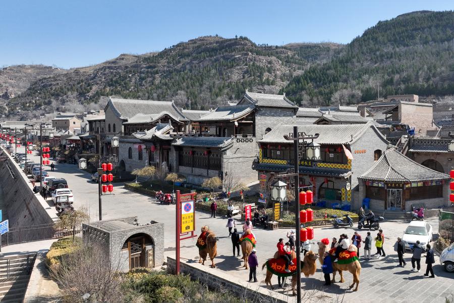 A drone photo taken on March 19, 2025 shows tourists riding camels in the Qikou ancient town of Linxian County, north China's Shanxi Province. (Xinhua/Zhan Yan)