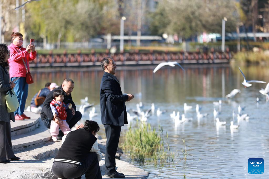 People feed black-headed gulls in Yinchuan, northwest China's Ningxia Hui Autonomous Region, Oct. 31, 2025. (Xinhua/Lyu Ze)