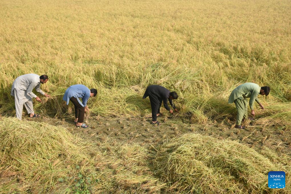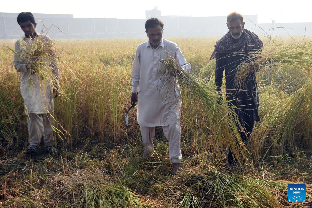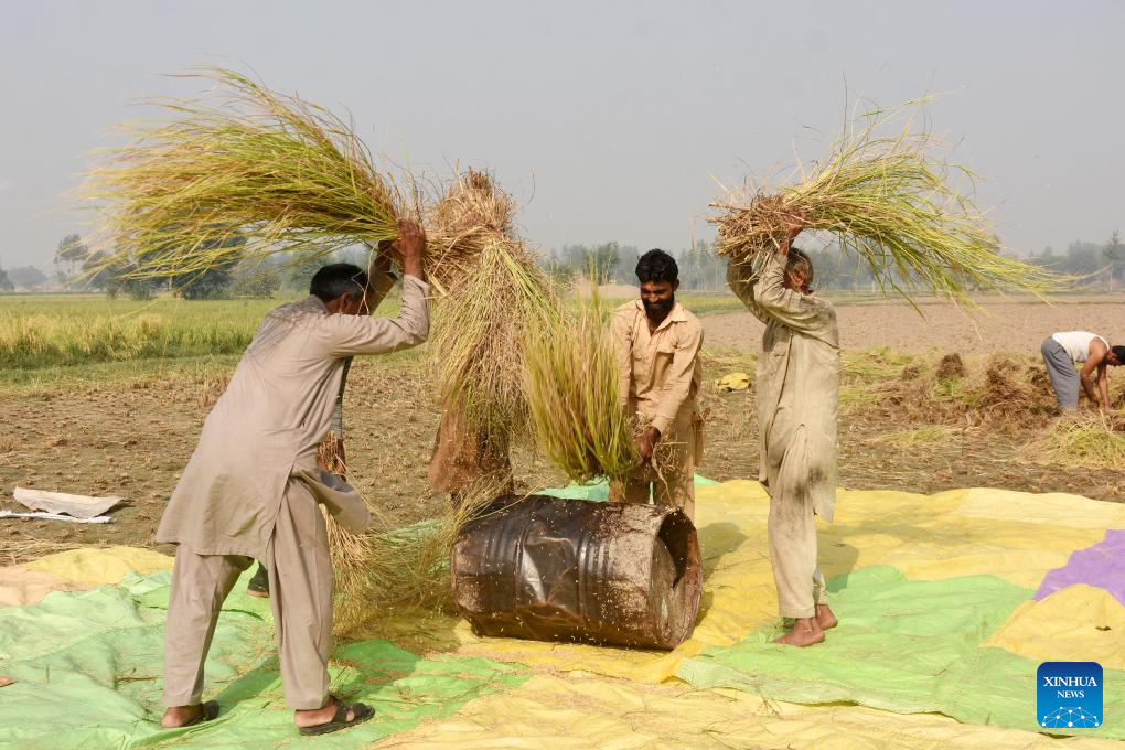 Farmers work at a paddy field in Lahore, Pakistan on Oct. 31, 2025. (Photo by Sajjad/Xinhua)