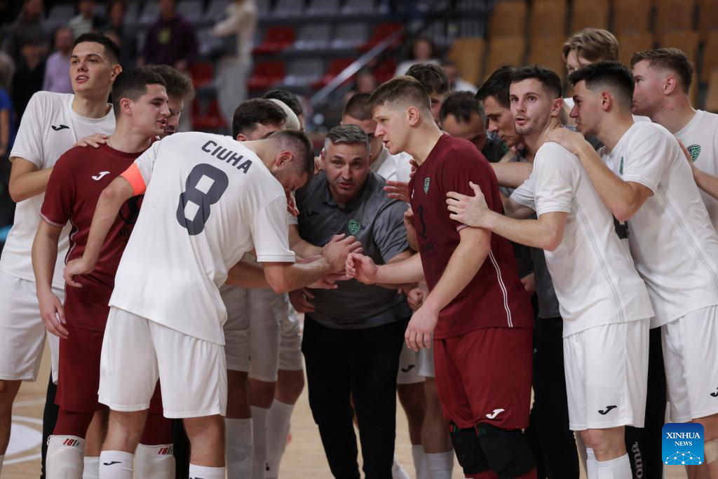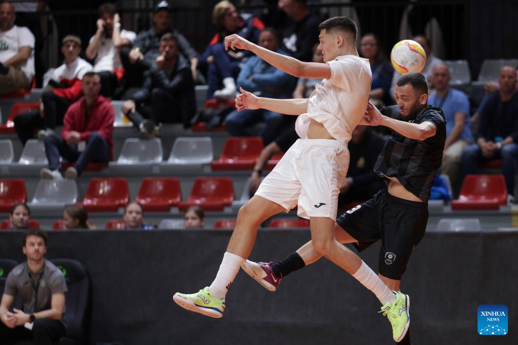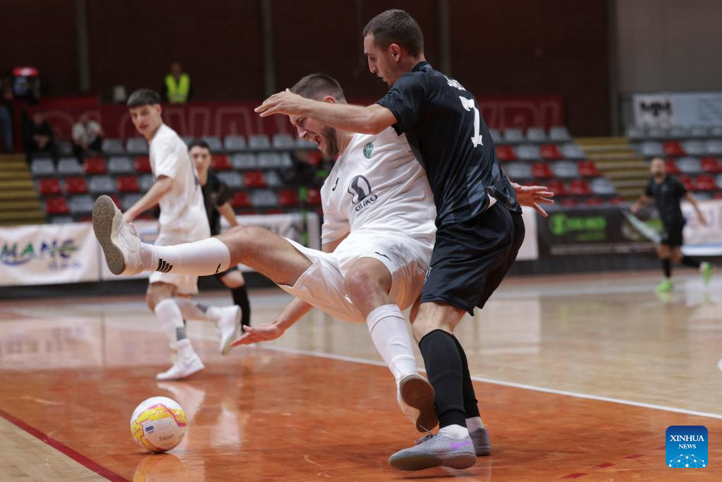 Lovro Trdin (L) of Vrhnika vies for a header with Berat Ramadani of Forca during the UEFA Futsal Champions League Main Round Group 8 match between Vrhnika of Slovenia and Forca of North Macedonia in Ljubljana, Slovenia, Oct. 30, 2025. (Photo by Zeljko Stevanic/Xinhua)