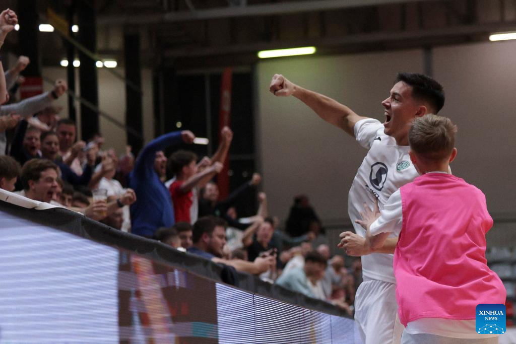 Tod Ciuha (L) of Vrhnika celebrates after scoring during the UEFA Futsal Champions League Main Round Group 8 match between Vrhnika of Slovenia and Forca of North Macedonia in Ljubljana, Slovenia, Oct. 30, 2025. (Photo by Zeljko Stevanic/Xinhua)