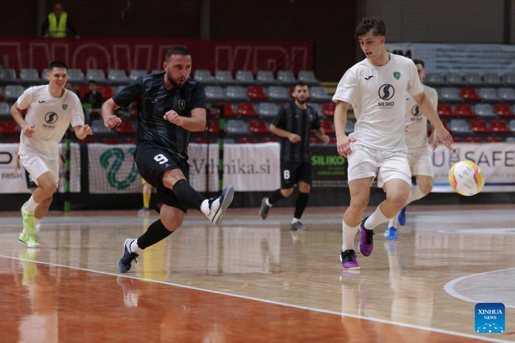 Jure Suban (L) of Vrhnika shoots during the UEFA Futsal Champions League Main Round Group 8 match between Vrhnika of Slovenia and Forca of North Macedonia in Ljubljana, Slovenia, Oct. 30, 2025. (Photo by Zeljko Stevanic/Xinhua)