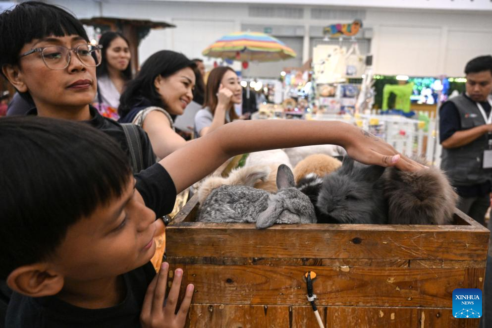 A boy touches rabbits during Indonesia International Pet Expo (IIPE) 2025 in Tangerang, Banten province, Indonesia, Oct. 31, 2025. The IIPE is a leading platform in Indonesia for pet-related products and services, drawing pet lovers and industry professionals. The expo is held here from Oct. 31 to Nov. 2. (Xinhua/Agung Kuncahya B.)