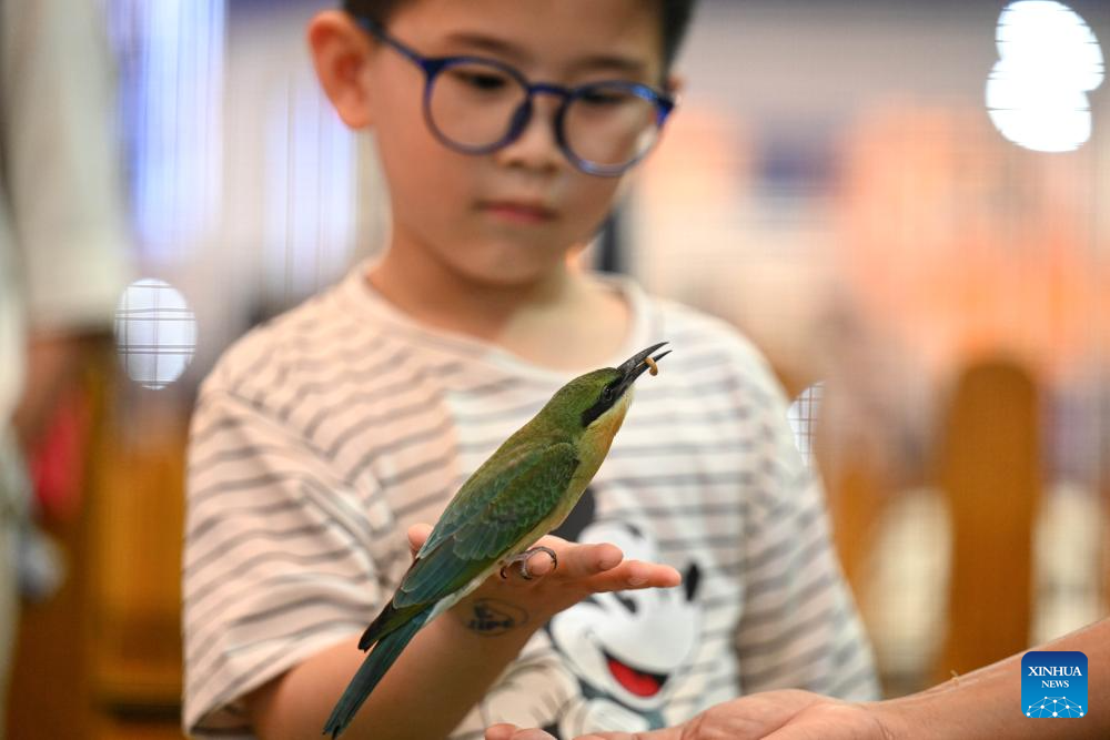 A boy looks at a bird that is being fed during Indonesia International Pet Expo (IIPE) 2025 in Tangerang, Banten province, Indonesia, Oct. 31, 2025. The IIPE is a leading platform in Indonesia for pet-related products and services, drawing pet lovers and industry professionals. The expo is held here from Oct. 31 to Nov. 2. (Xinhua/Agung Kuncahya B.)