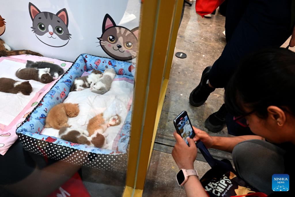 A visitor takes photos of sleeping kittens during Indonesia International Pet Expo (IIPE) 2025 in Tangerang, Banten province, Indonesia, Oct. 31, 2025. The IIPE is a leading platform in Indonesia for pet-related products and services, drawing pet lovers and industry professionals. The expo is held here from Oct. 31 to Nov. 2. (Xinhua/Agung Kuncahya B.)